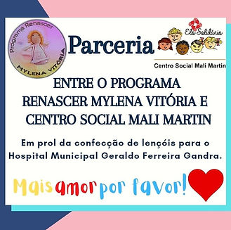 Aconteceu nos meses de Junho e Julho do ano vigente, uma parceria entre o Programa Renascer Mylena Vitória e o Projeto Elo Solidário do Centro Social Mali Martin, que se somaram com ações de coletividade e solidariedade, confeccionando lençóis, viróis e fronhas que posteriormente foram doadas ao Hospital Municipal Geraldo Ferreira Gandra. A mão de obra foi doada por costureiras, ex-alunas do C.S.M.M que cederam o seu tempo para realizar tal ato de amor ao próximo.